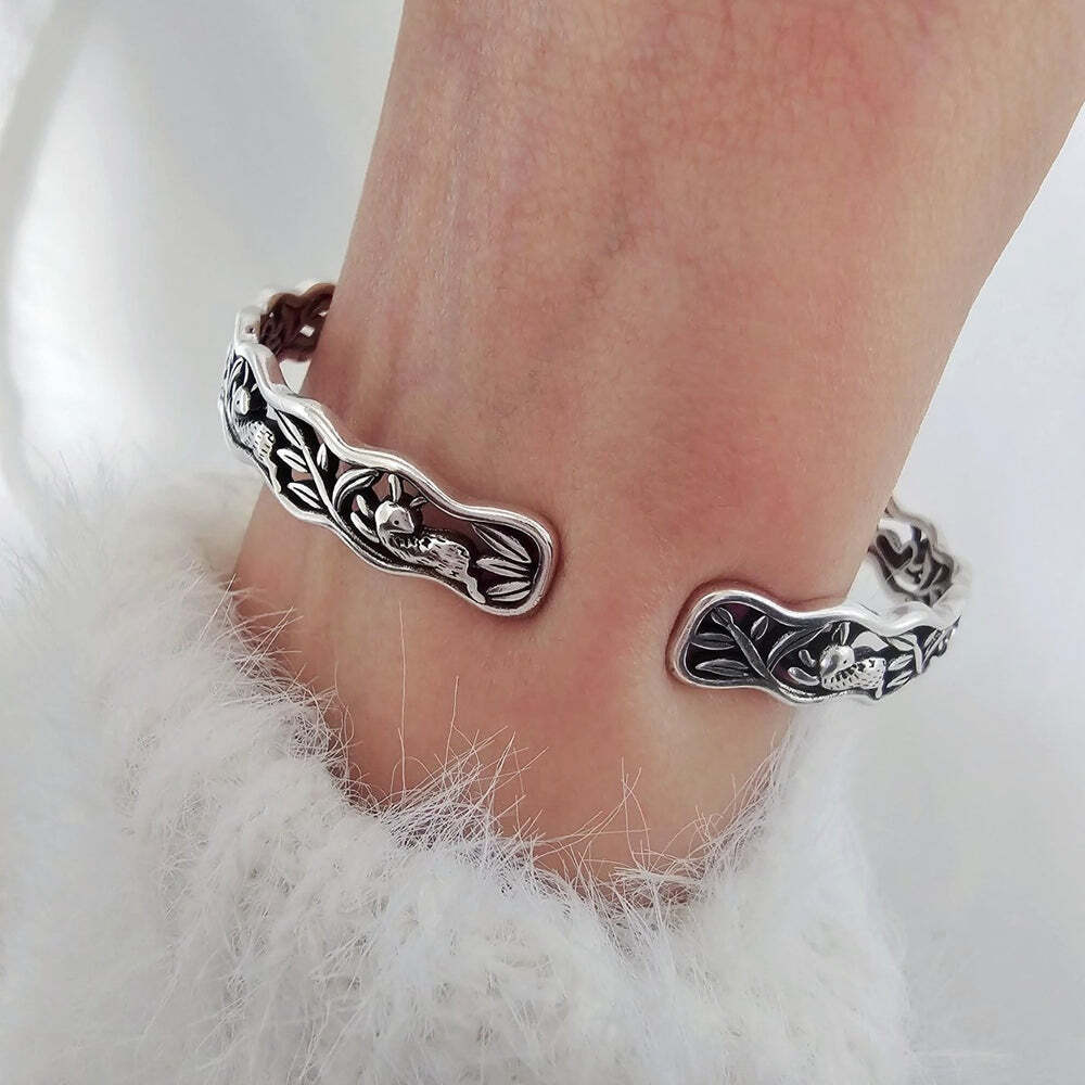 Rabbit Patterned Wavy Open Bracelet Patinated Sterling Silver Plated