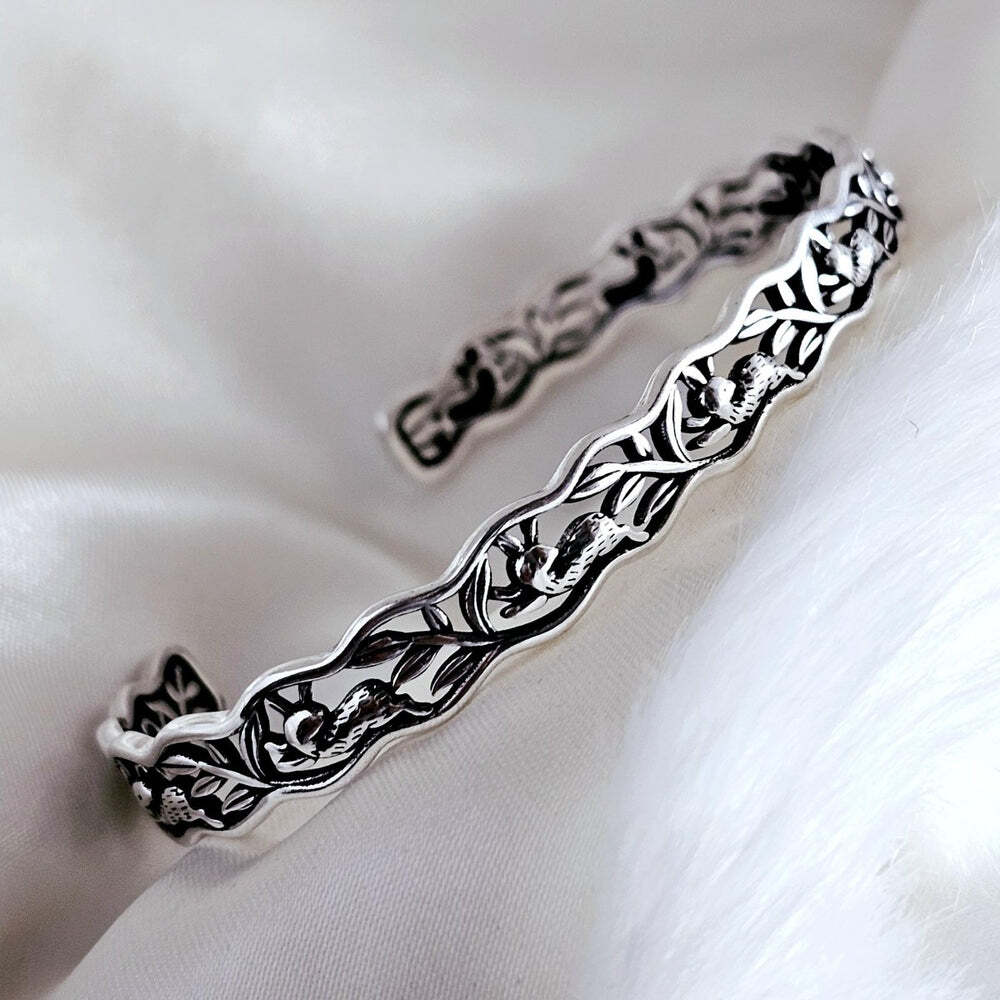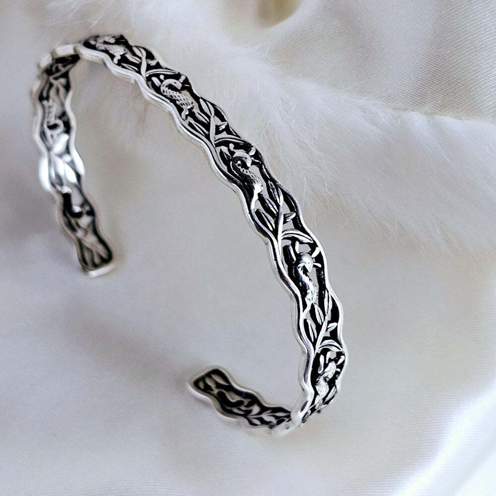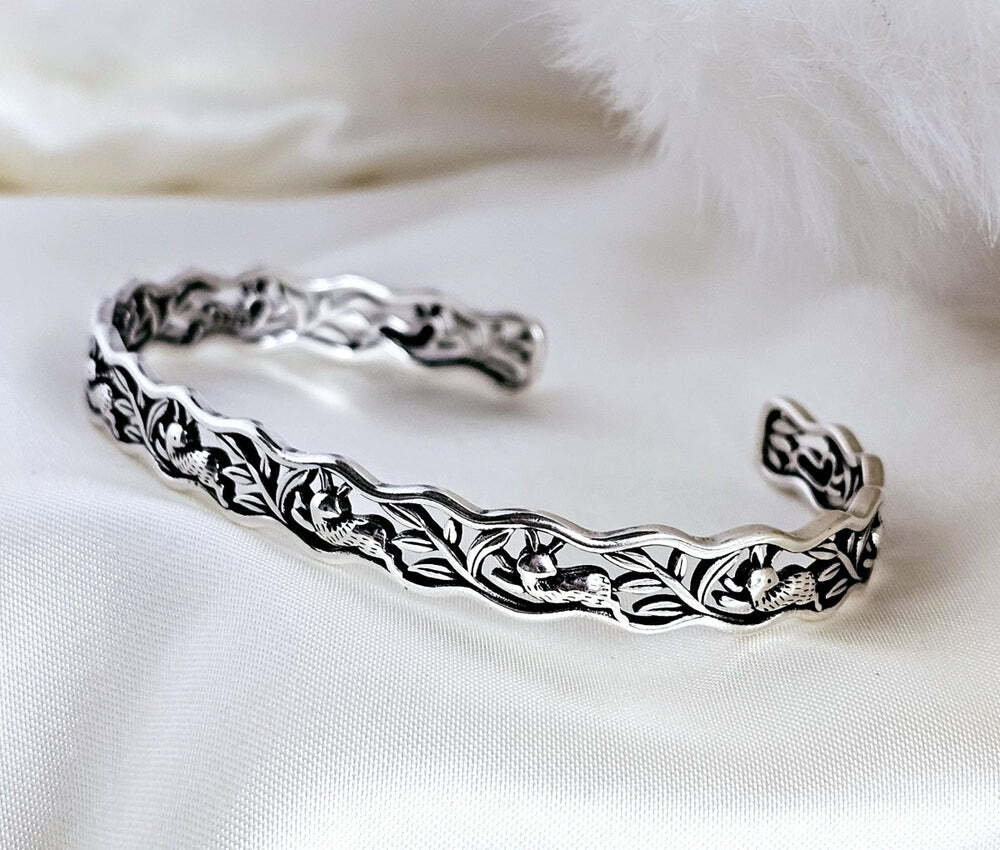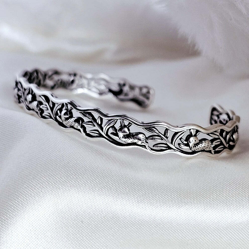 Adding a dash of charm with these delicate bunnies! This beautiful Sterling Silver bracelet with patinated oxidized effect and intricate textured details has carved running rabbits in the bushes. This gorgeous cuff bangle could easily dazzle amongst the stacked lot or simply choose this to wear as a statement piece. ITEM DETAILS: Sterling Silver - Oxidized accents Model wrist measures: 15.5 CM (shortest width) widens up to 17.5 cm Presented in our signature branded packaging, ready to gift or cherish. 99% Certified Eco-friendly packaging. Gift Wrapping Available