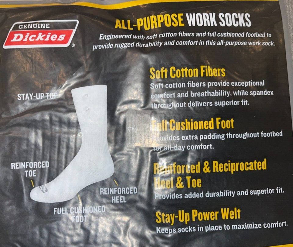 WE BUY DIRECTLY FROM DICKIES, SO YOU GET A FRESH BATCH OF SOCKS DIRECTLY FROM DICKIES, YOU DON'T HAVE TO WORRY ABOUT THESE SOCKS BEING IN TRUCKS OR WAREHOUSES OR RETAIL STORES WHERE THOUSANDS OF PEOPLE TOUCH THEM ON DAILY BASIS. EACH PAIR OF SOCKS ARE FRESH FROM THE FACTORY AND NOT SITTING IN A WAREHOUSE FOR MONTHS AT A TIME. PLEASE MAKE SURE YOU PICK THE RIGHT SIZE AS WE DO NOT ACCEPT RETURNS ON SOCKS AND UNDERWEAR, WE WILL NEVER SELL OR RE-SELL ANY ITEM THAT TOUCHES A PERSON'S FOOT. THIS POLICY IS TO PROTECT CUSTOMERS FROM RECEIVING TAINTED ITEMS.