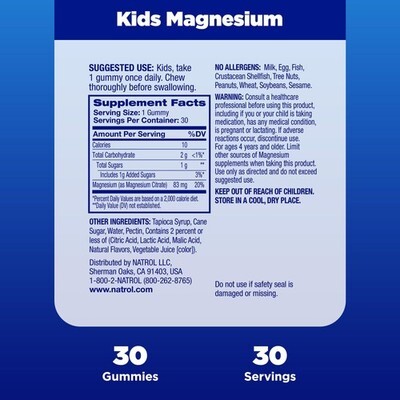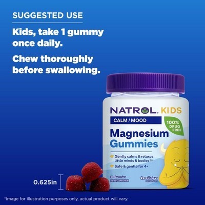 Expiration Date of 06/2026 ? KIDS MAGNESIUM GUMMIES: Natrol Kids Magnesium Citrate Gummies gently calm and relax little minds and bodies for those low in Magnesium and are safe for kids ages four and up(1) ? KIDS SUPPLEMENTS: These kids supplements are made without artificial flavors, sweeteners, or synthetic dyes; these magnesium gummies are also non-GMO, vegetarian and gelatin-free ? SUPPORTS MUSCLE RELAXATION: Magnesium is an essential mineral that supports healthy muscle relaxation and function(1) ? 100% DRUG FREE SUPPLEMENT: A tasty and convenient source of Magnesium for kids, this supplement comes with a 30 day supply of great tasting gummies and is 100% drug free and free of common food allergens ? DRUG FREE SLEEP AID BRAND IN AMERICA(2): As the drug free sleep aid brand, we not only have formulas to help you fall asleep faster, we also offer fast-acting and effective formulas that can help calm your mind and body and maintain good health