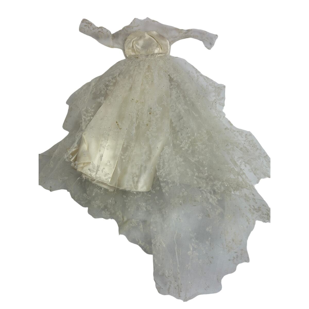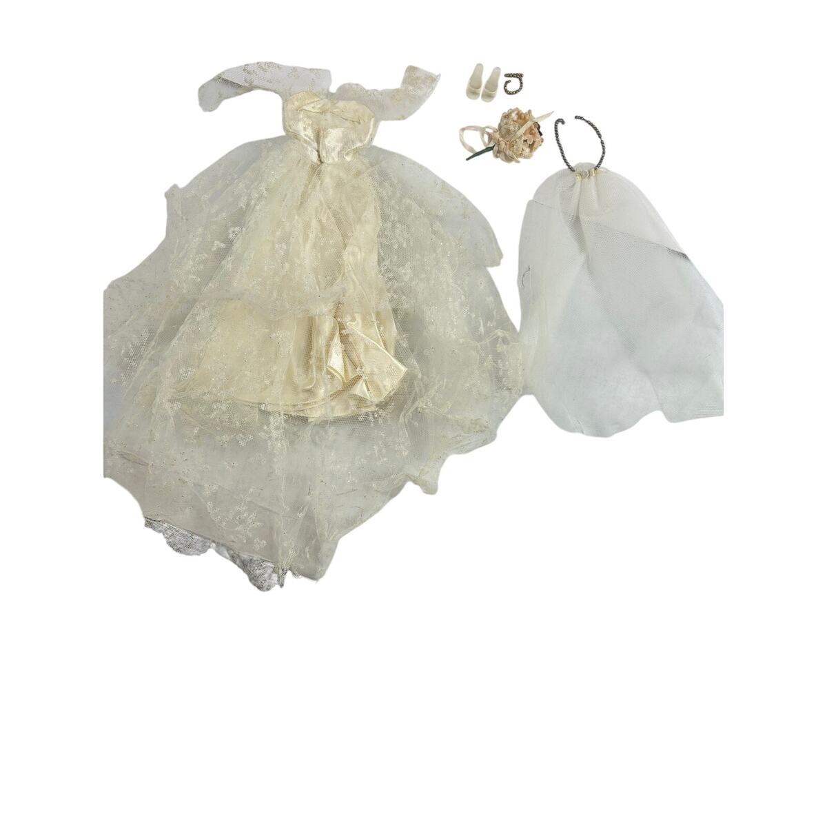 Barbie?s first wedding gown set, produced by Mattel. This version includes the iconic layered white tulle gown over satin, original ?Barbie by Mattel? tag, long veil with pearl headband, bridal bouquet, white closed-toe heels, and pearl necklace.