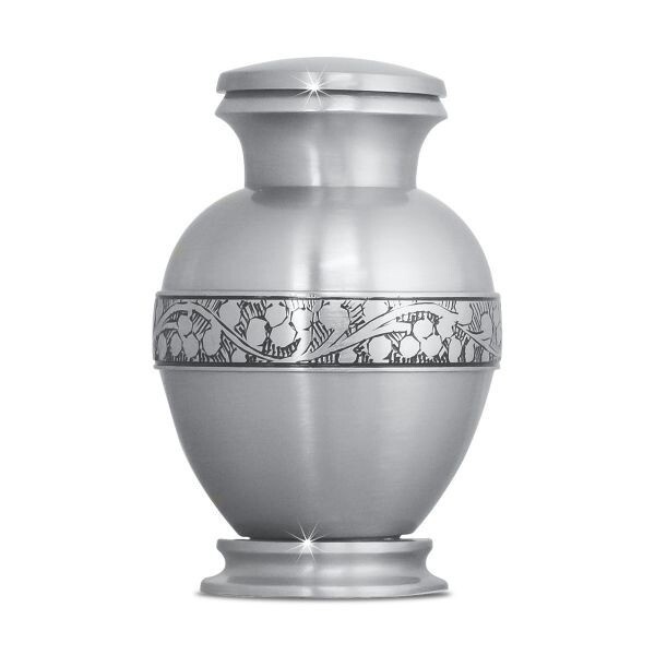 This pewter infant urn, finished in soft satin and adorned with a floral band, reflects love, protection, and remembrance. Sized for infants, it provides a comforting and enduring way to honor a precious little life.