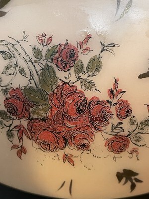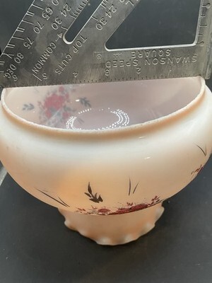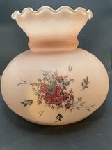 The product is a vintage pink and red floral glass lamp shade, hand-painted with a pink globe. This lamp shade features a beautiful floral pattern on frosted glass, adding a touch of elegance and charm to any room. Perfect for adults looking to add a vintage touch to their space, this unique piece is a lovely addition to any collection of lamps or lighting fixtures.