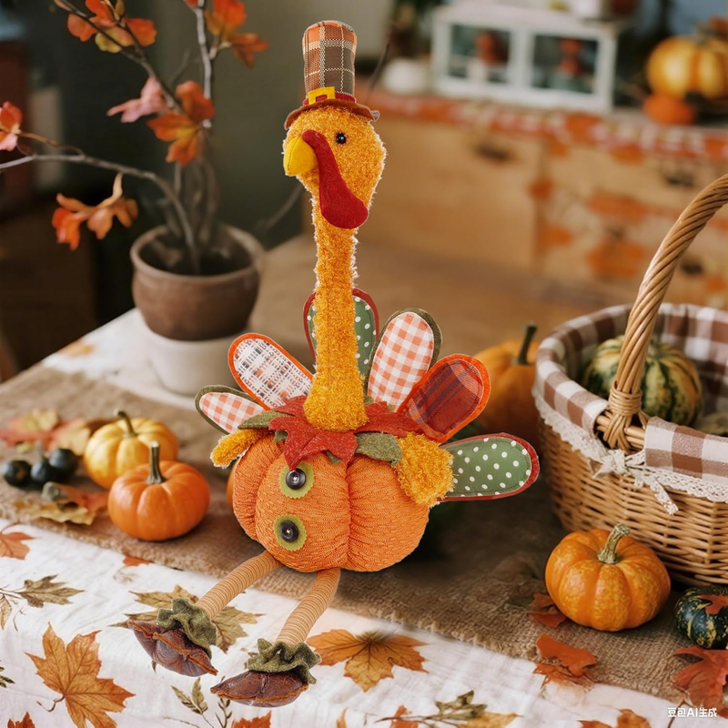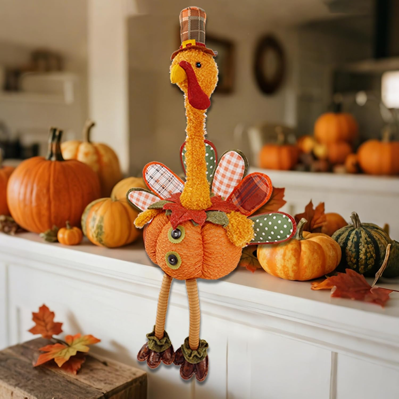Bring Thanksgiving to Life with Our Interactive Plush Turkey! Meet your new holiday mascot?a 31.5"" jumbo plush turkey featuring a stretchable head and dangling legs! Designed for indoor thanksgiving decorations, this charismatic bird sports a chic plaid top hat, vibrant wings, and leaf-shaped neck.