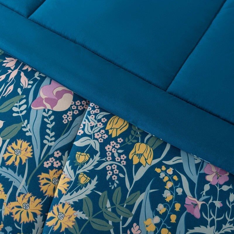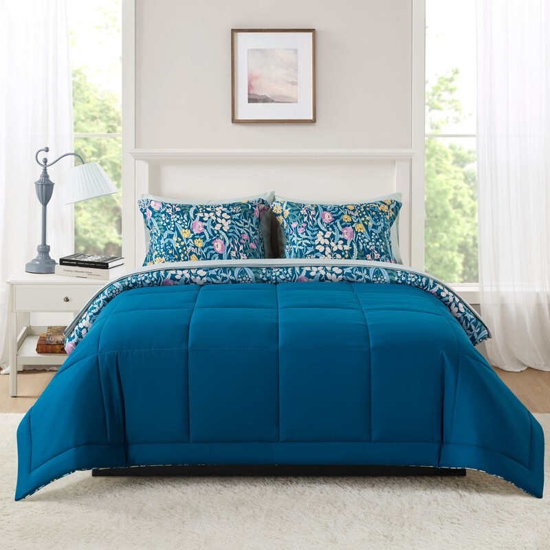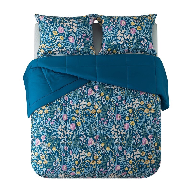 Transform your bedroom into a lush, garden-inspired retreat with the Mainstays Blue Floral bedding set. This stunning bedding collection is designed to combine the beauty of nature with unmatched comfort, making it the perfect choice for anyone looking to add elegance and warmth to their space. The reversible comforter allows you to change your look anytime you want, featuring a bold floral print, with rich hues of green, purple, and yellow, on one side and a matching blue solid on the other. The set includes a comforter, pillowcases (twin set includes 1 pillowcase), matching pillow shams (twin set includes 1 sham), and a coordinating soft solid green sheet set. Sewn-through box quilting keeps the lofty comforter fill evenly distributed, ensuring the perfect fluff to keep you warm during any season. Available in Twin/Twin XL, Full, Queen, and King sizes so you have plenty of options to make this bedding set work in your home. All pieces in this Bed-in-a-Bag Comforter set are made from an incredibly soft polyester, and are machine washable, making them easy to care for. This unisex set is suitable for kids, teens, and adults.