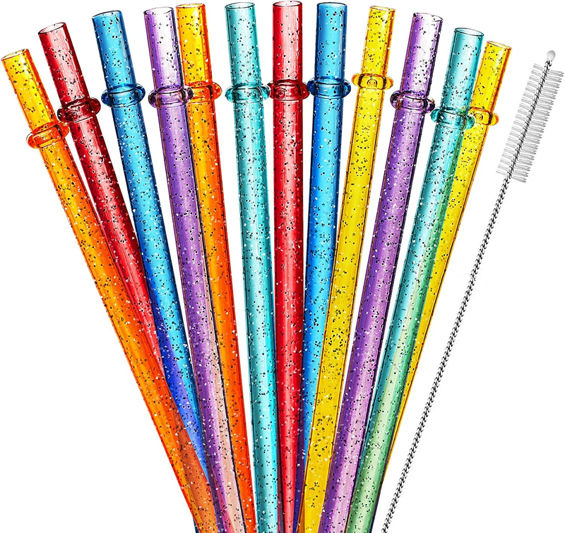 12-Pack Glitter Reusable Colorful Plastic Straws, 11 Inches Clear Bpa-Free Unbreakable Sparkle Tumbler Drinking Straws with Cleaning Brush