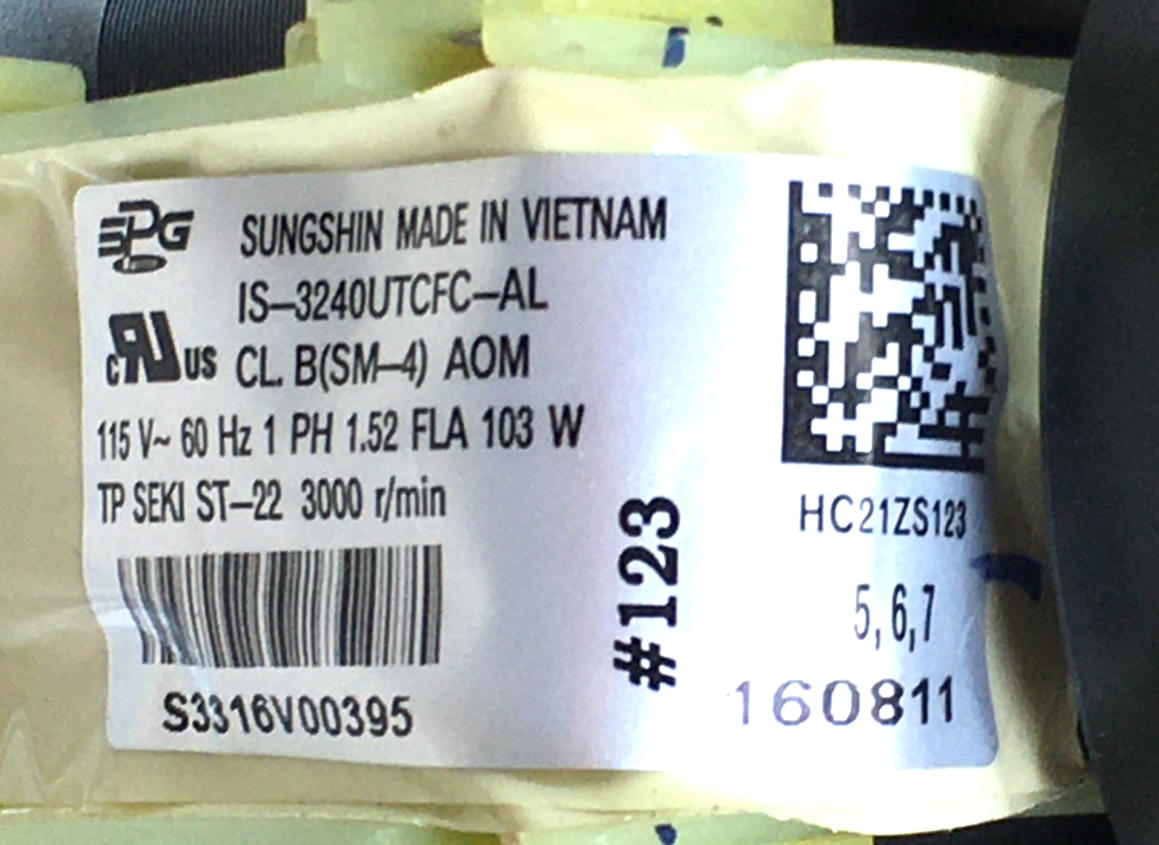 This is Carrier HC21ZS123 SUNGSHIN IS-3240UTCFC-AL 115V 3000 RPM Inducer Motor used part, tested, excellent condition.