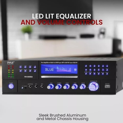 The Pyle Home Theater Receiver provides versatile audio and video entertainment. High-Powered stereo preamplifier performance comes loaded with audio playback features including front-loading CD/DVD player, AM/FM radio, USB SD flash memory readers, aux (3.5mm) input and two 1/4'' -inch microphone inputs. Connect external surround sound speakers to create a cinema-style media experience in your living room. Bluetooth wireless receiver ability is compatible with all of today?s latest devices and features hassle-free setup for instant music streaming. Get connected to your entire home theater system including the TV, DVD player, soundbar, subwoofers and multi-channel speakers for full-ranged pro audio stereo sound enjoyment. Rear panel connector types include speaker terminal binding posts, RCA audio inputs, dedicated subwoofer output, digital optical audio output, component S-video connector -- along with a headphone jack for private listening. MP3 digital audio file support allows you to playback your entire digital media file library while you configure your sound via the front panel button control center. Enjoy versatile audio entertainment ability with the Pyle Bluetooth Home Theater Stereo Receiver System.