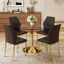 35" Round Glass Dining Set: Gold Base, 4 Black PU Chairs