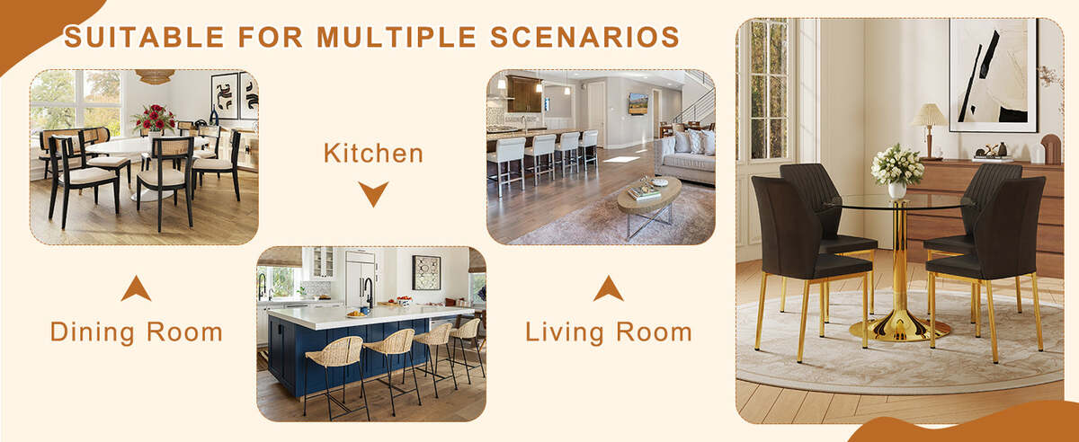 Spacious Table Top: The round table top with a diameter of 35 inches is made of transparent tempered glass with smooth edges, providing ample dining space suitable for family gatherings and social activities.Stable Support: The cylindrical legs are made of metal with a gold spray coating, paired with a round gold base, providing stable support.