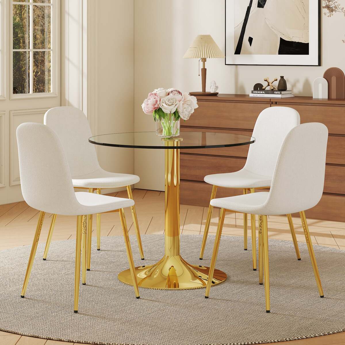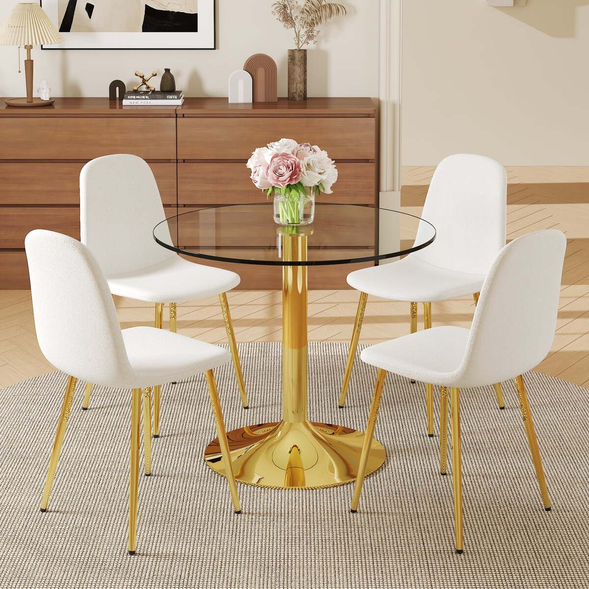 35" Round Gold Glass Dining Table & 4 White Chairs Set