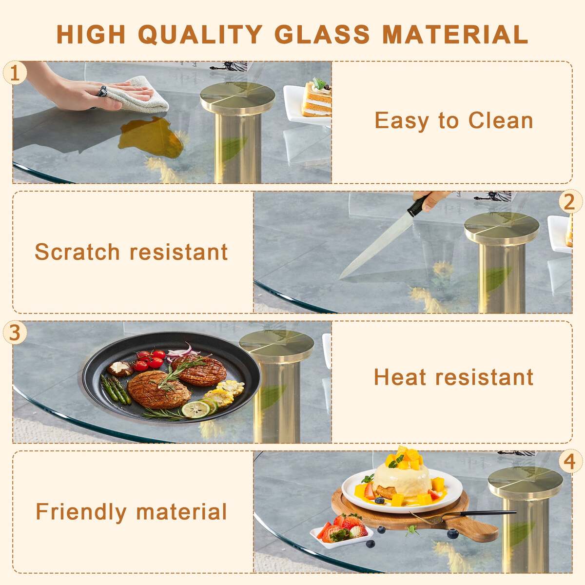 Spacious Table Top: The round table top with a diameter of 35 inches is made of transparent tempered glass with smooth edges, providing ample dining space suitable for family gatherings and social activities.Stable Support: The cylindrical legs are made of metal with a gold spray coating, paired with a round gold base, providing stable support.
