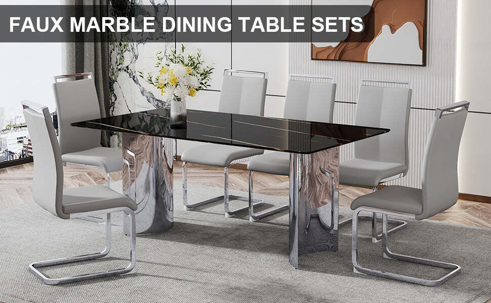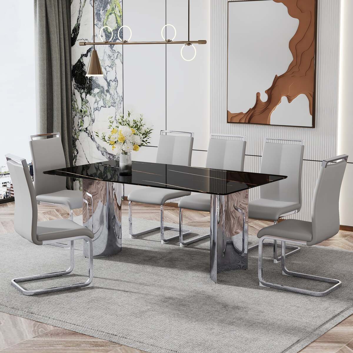 6-Seater Marble Glass Dining Set w/Gray PU Chairs & SS Legs