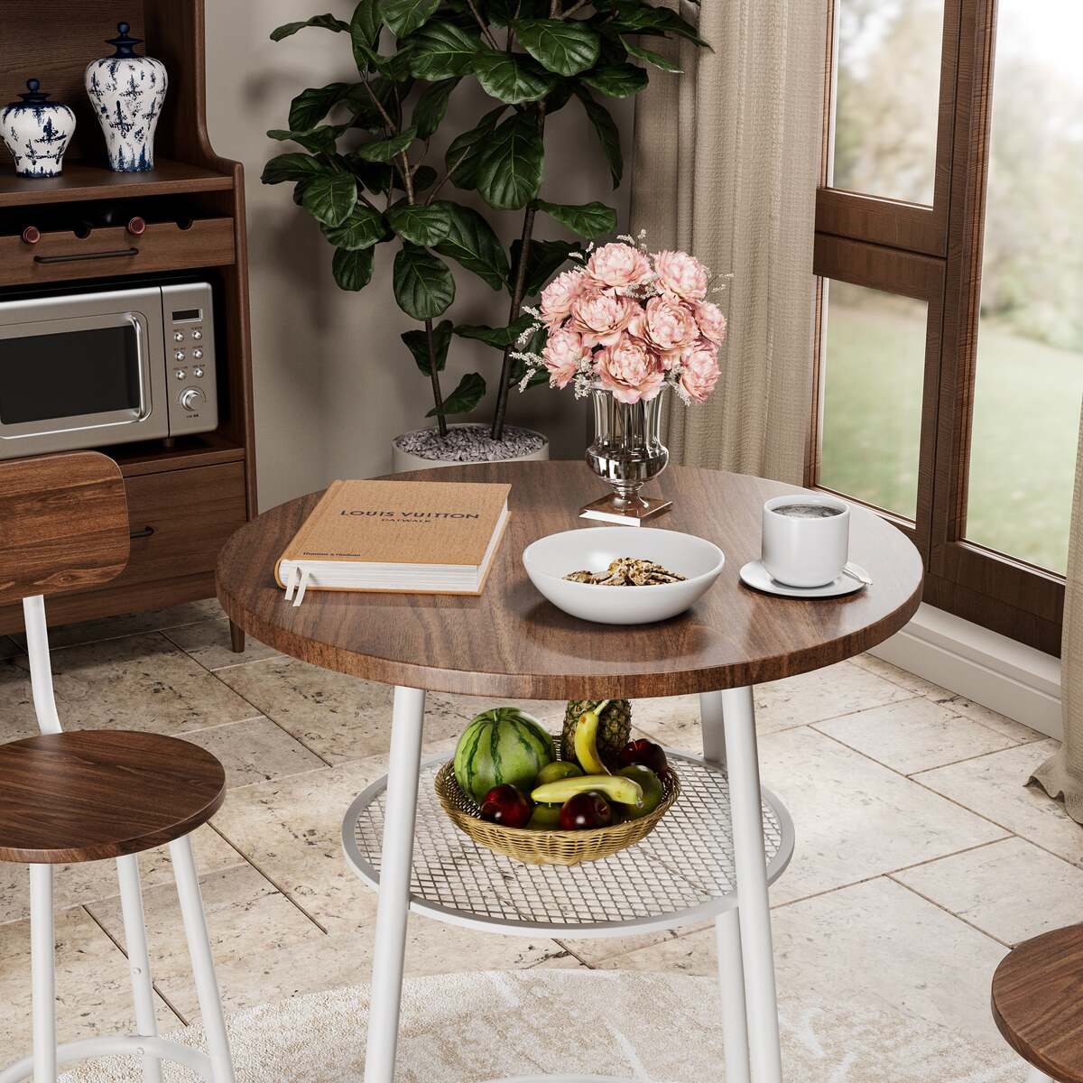 ?Versatile 3-Piece Set?Includes: 1 round table + 2 stools. Multi-scenario use: breakfast bars, balcony cafes, or as supplementary dining furniture (supports 250lbs per stool).