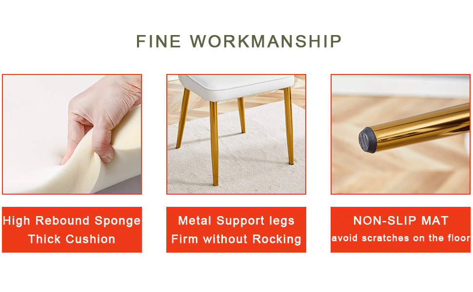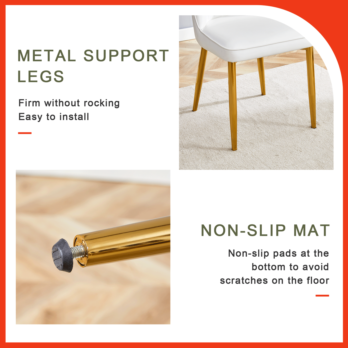 Golden Metal Chair Legs: Four gold metal chair legs with anti-slip pads at the bottom echo the table leg design, ensuring a unified overall style.Anti-Slip Protective Feet: The anti-slip feet design at the bottom of the chair legs protects the floor from scratches and increases the safety of the chair during use.