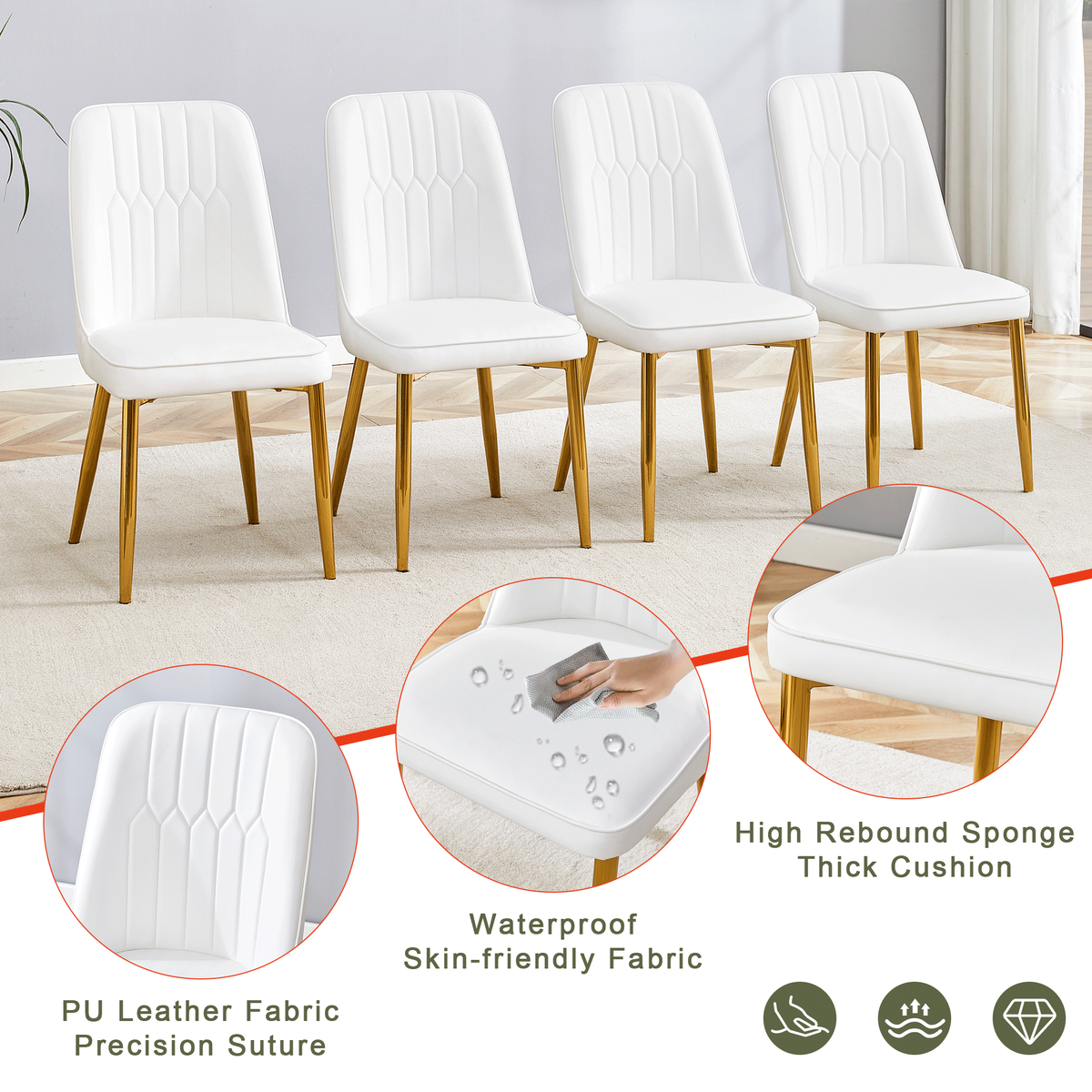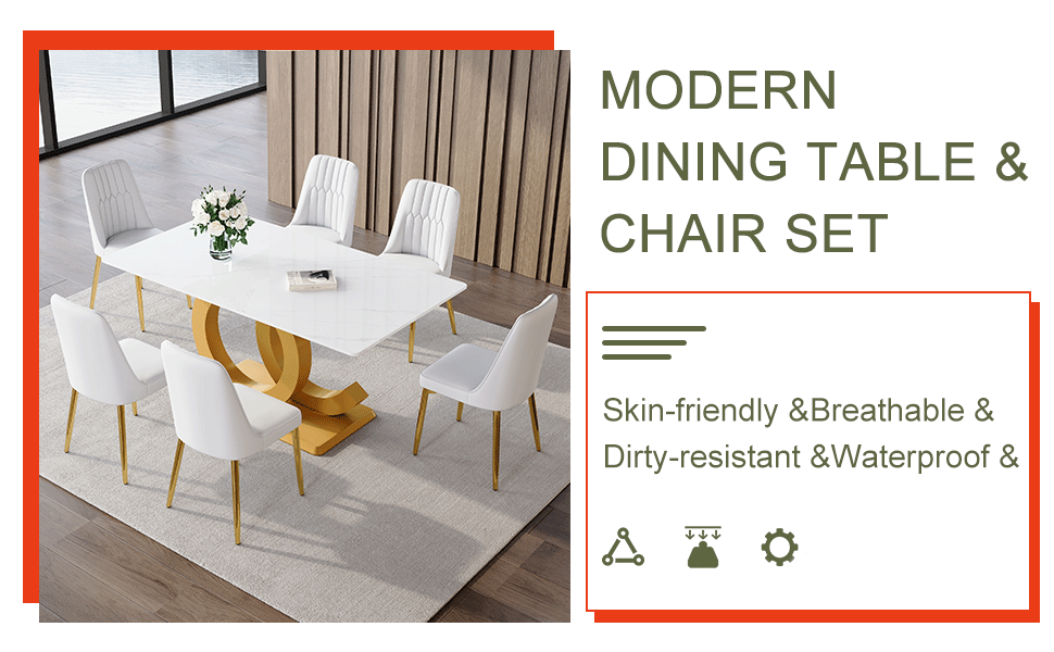 PU Material Chairs: The chairs are made of PU material with a overall white color design and simple line backrests, coordinating with the table's style.Comfortable Sponge Padding: The chairs are filled with sponge for a soft and comfortable sitting experience, enhancing the enjoyment of dining.