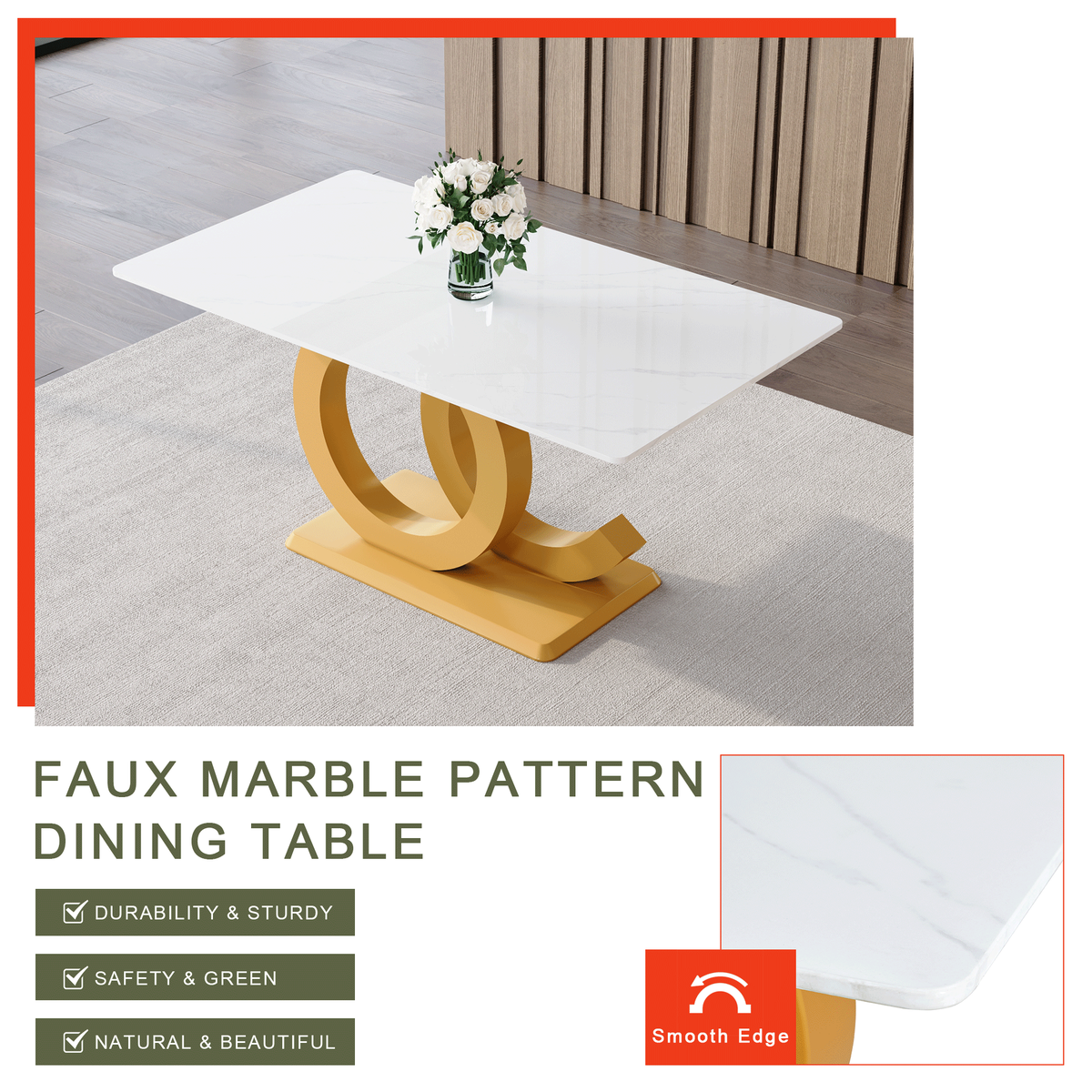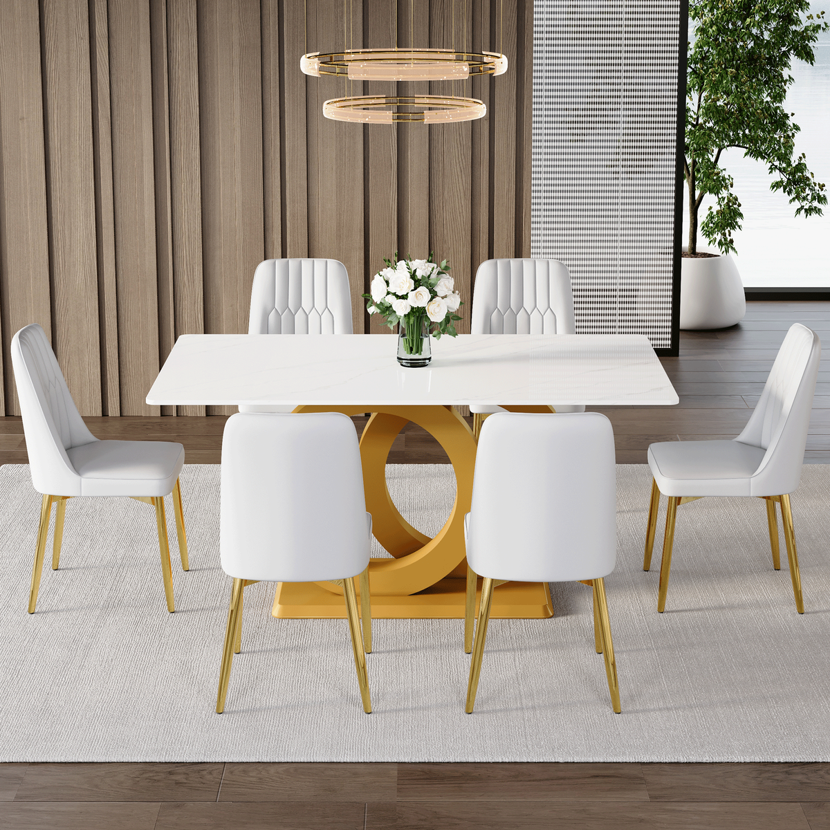 6-Seat Luxury Tempered Glass Dining Set, White Marble Top, Gold Legs