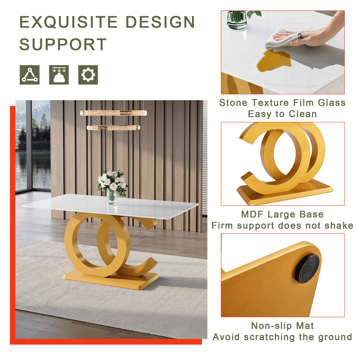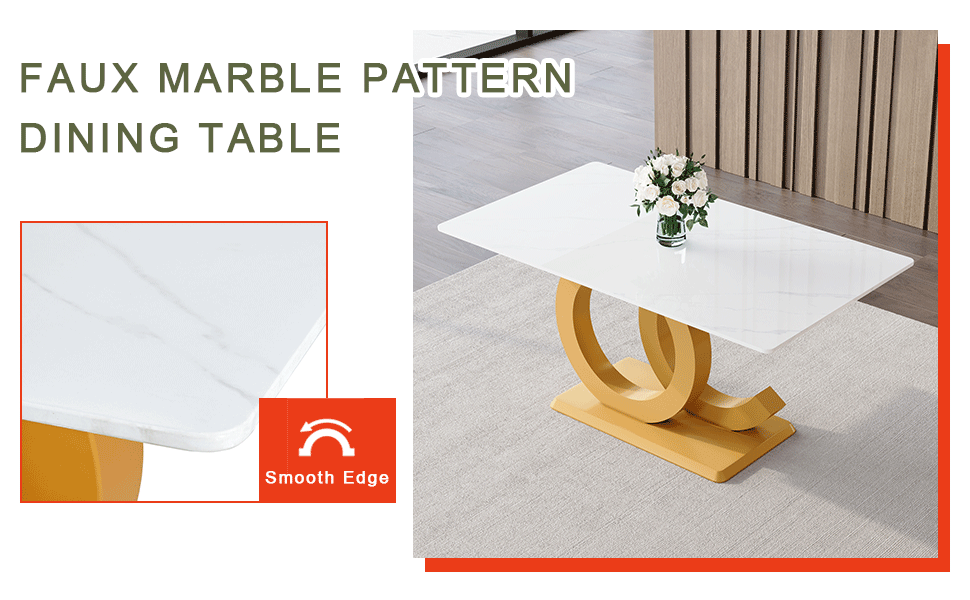 OC-Type MDF Legs: The legs are designed in an OC shape, made of MDF material, sprayed with gold glossy paint, wear-resistant and shiny.Golden Base: The golden base design adds stability and safety to the dining table, equipped with anti-slip feet to protect the floor.