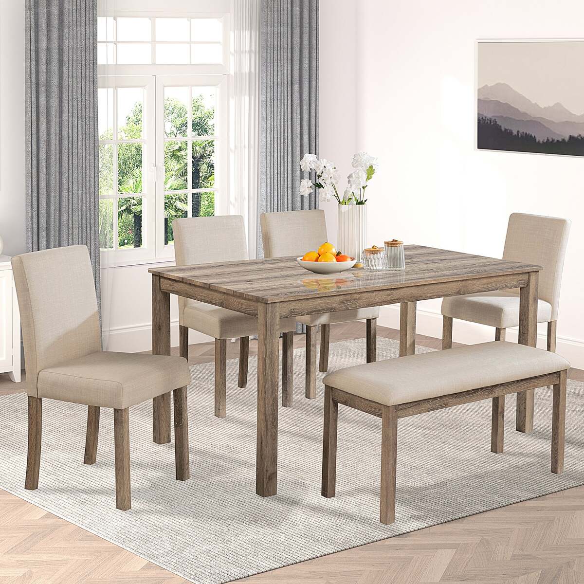 6-Piece Dining Table Set with Bench: This dining set is the perfect choice for your home. It includes a table, four chairs and a multi-purpose bench to seat family and guests comfortably without feeling cramped. It is ideal for family gatherings, dining rooms or kitchens and will create a beautifully relaxed dining experience