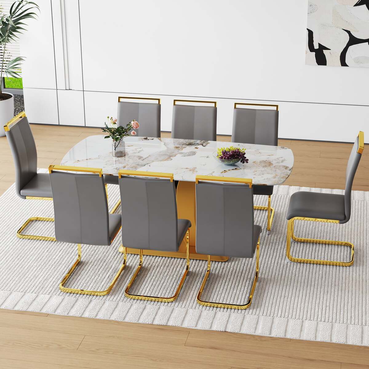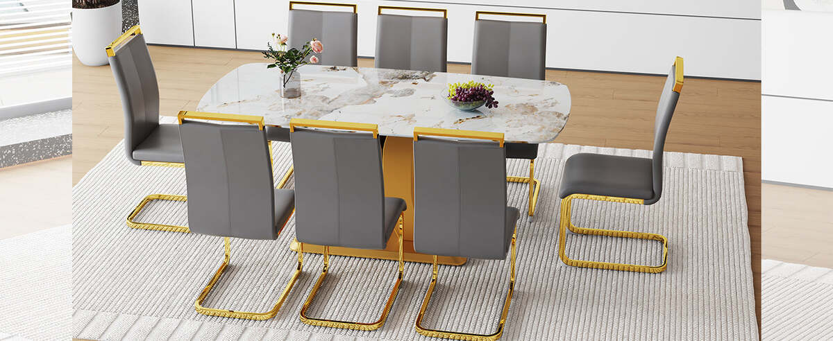 Place of Origin #originPlace# Main Color Dark Gray,White+Gold Main Material MDF+glass,Metal,PU Leather Seating Capacity Seats 8 Dangerous Goods #dangerFlag#
