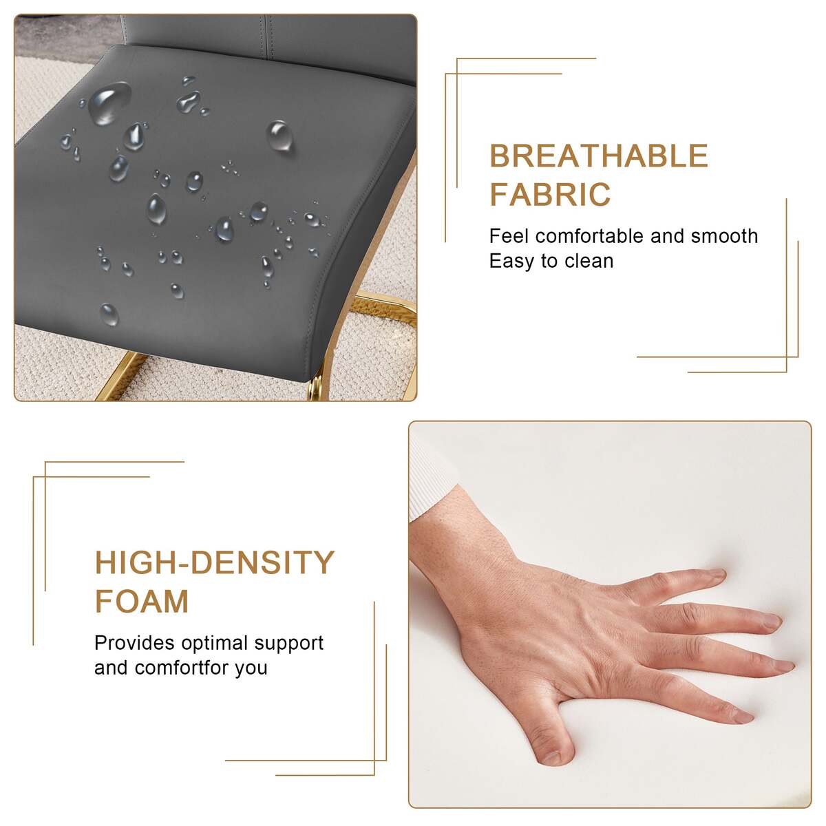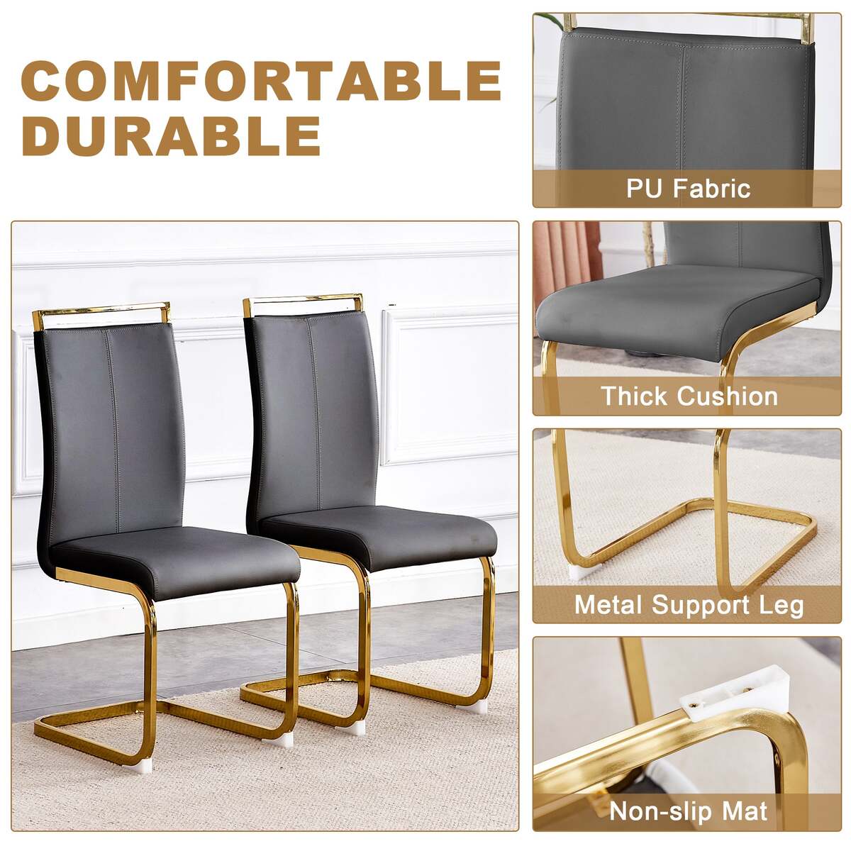 Stable Arched Metal Legs: The golden arched metal legs not only add a sense of design but also provide strong support, ensuring the stability and durability of the chair.Keeping the secure of the seat during use.Anti-Slip Protective Feet: The anti-slip feet design at the bottom of the chair legs protects the floor from scratches and increases the safety of the chair during use.