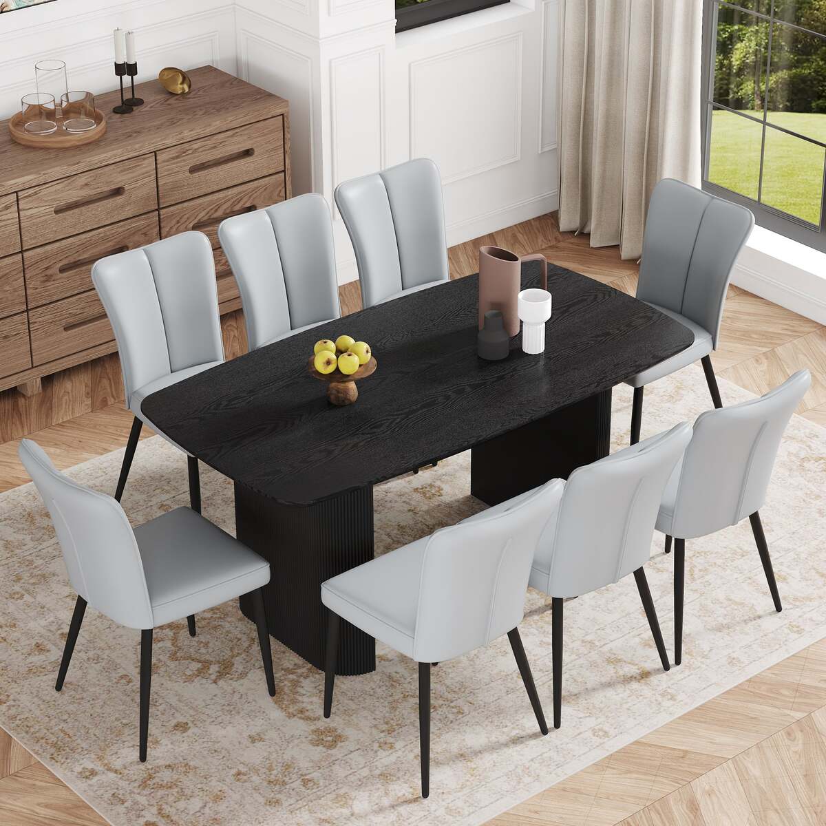 Black Wood Grain Dining Table Set 8 Gray PU Chairs - 67" MDF