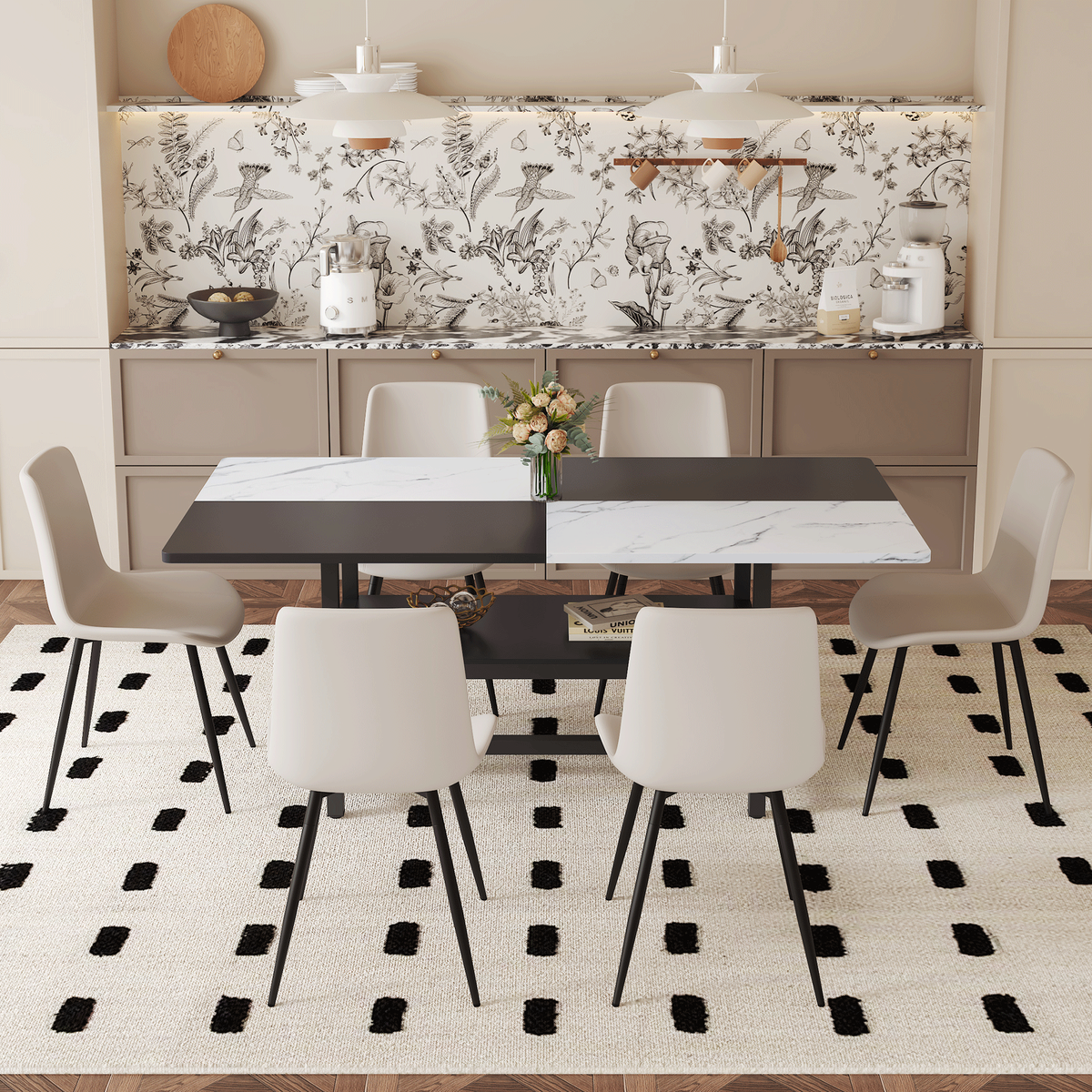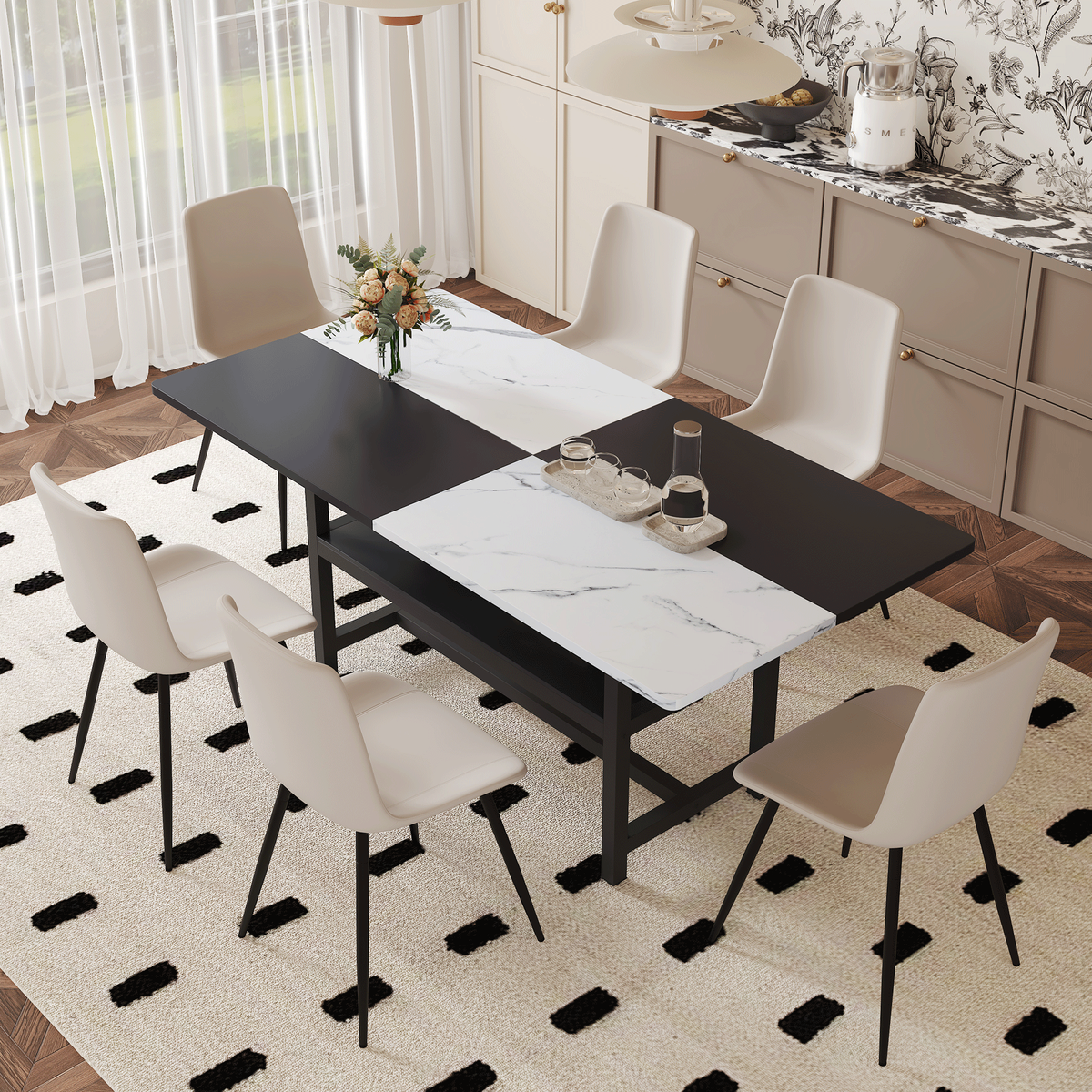 White & Black Spliced Dining Table Set 6 Gray PU Chairs Storage