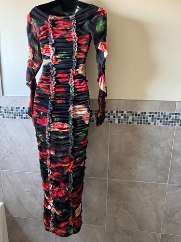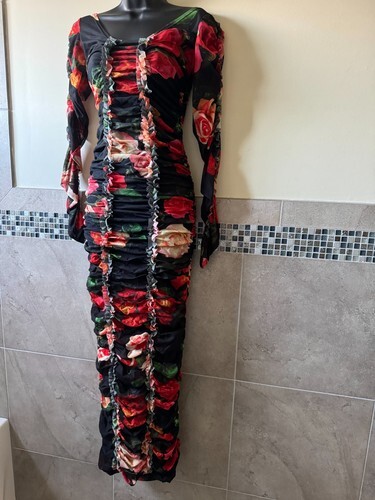 MOLLY GODDARD Black Red Green Floral Print Ruched Long Sleeve Dress SZ US4/UK6