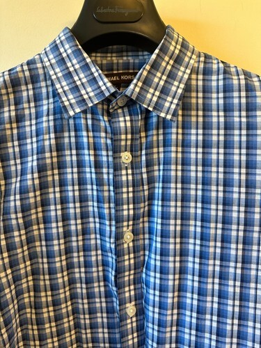 This Michael Kors blue plaid convertible sleeve button down shirt is in excellent condition with no signs of damage of any kind. It features: