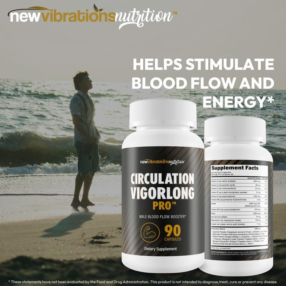 ADVANCED BLOOD FLOW SUPPLEMENT FOR MEN - Circulation Vigorlong Pro are men's blood flow supplements designed to help blood flow throughout the body. Formulated with our vigorlong top ten vitamins, minerals, amino acids, natural extracts, and antioxidants, these blood circulation supplements for men provides support for good blood flow, circulation, and oxygen delivery. Our best nitric oxide booster for men helps promote blood flow, boost energy levels, enhance brain health, and support overall vitality, making it ideal for anyone seeking poor circulation supplements, circulation vigor long pills, or blood flow circulation supplements to enhance their daily wellness routine.