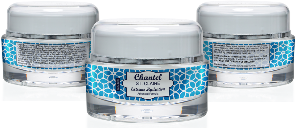 Your new secret weapon in the war against aging! Chantel St. Clair Extreme Hydration Moisturizer provides rapid restoration of dry and flaky skin for a healthier youthful look!! This is the new breakthrough moisturizer, designed to lock in maximum hydration. It penetrates to the cellular level repairing and restoring the skin's natural moisture balance with the help of free radical fighting antioxidants.Built with powerful natural antioxidants to help improve cellular restoration and advanced peptides to boost collagen, this moisturizer is a powerhouse of youth to keep you looking young and refreshed!
