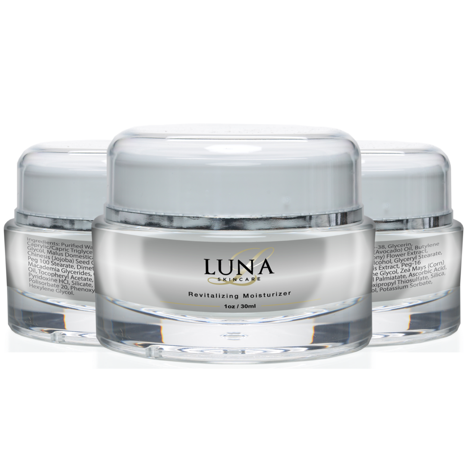You will love your skin from morning to night when you see what Luna Skincare Revitalizing Moisturizer can do. Our easy to apply face cream requires a small amount applied morning and night to reap all the benefits. It absorbs quickly and does not leave you skin looking or feeling greasy. Instantly notice your skin illuminate as it sips in the wonderful Luna Skincare ingredients containing antioxidants, that help fight free radicals and repair damaged skin. Enjoy gentle, yet potent moisture-enhancing elements that enhance your appearance and the radiance you will see as your skin's natural youthfulness and suppleness appears.