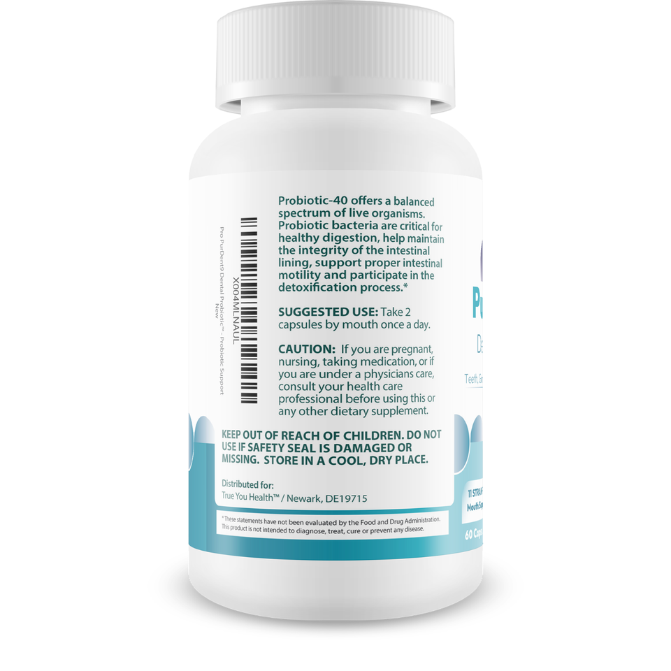 Pro PurDent9 Dental Probiotic is a comprehensive oral health probiotic formulated to support a balanced of good bacteria in the mouth, gums, and throat. This advanced daily formula delivers oral probiotics 11 strains 40 billion CFU with Vitamin D Zinc, combining well-researched probiotic strains with key nutrients to promote a healthy oral microbiome. Designed for the whole family, kids only need to take 1 capsule per day while adults need to take 2 for optimal support. Whether you're looking for pro dental probiotics for women and men, dental probiotics for kids, or reliable probiotics for mouth health to add to your daily wellness routine, Pro PurDent9 Dental Probiotic offers a convenient way to care for your smile and support your overall mouth wellness.