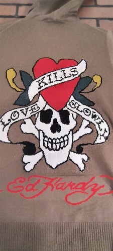 Brand new zip-up hoodie. 100% cotton Authentic and Licensed! Excellent Quality! * Ed Hardy by Christian Audigier * Front and rear embroidered Ed Hardy logo * Graphic print with rhinestone details * Slim fit (size up for looser fit) * 51% Nylon, 49% Wool Measurements: * Medium: pit-to-pit (18") * Large: pit-to-pit (19") * X-Large: pit-to-pit (20") * 2X-Large: pit-to-pit (22")