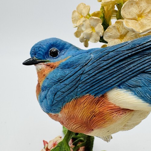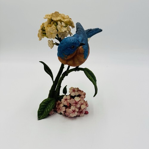 This Danbury Mint figurine by Bob Guge features a beautiful blue bird with a flower pattern, perfect for adding a touch of summer to your collection. Made of resin with a painted finish, this medium-sized figurine stands at 7 inches tall and is an original piece from the Seasons collection. It's a great addition for any adult collector and is sure to delight with its intricate details and charming design. Manufactured in 2001 in China, this Blue Bird figurine is a must-have for any fan of American-style decor.