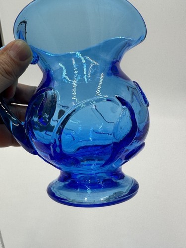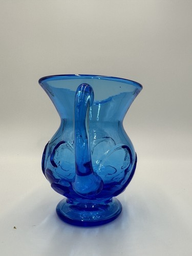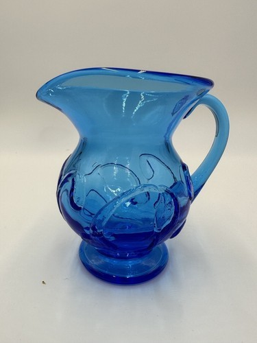 vintage hand blown electric blue pitcher or jug with applied handle and floral pressed pattern. The pitcher stands 5 1/2" tall and is in excellent vintage condition. Please see the photos for more details.