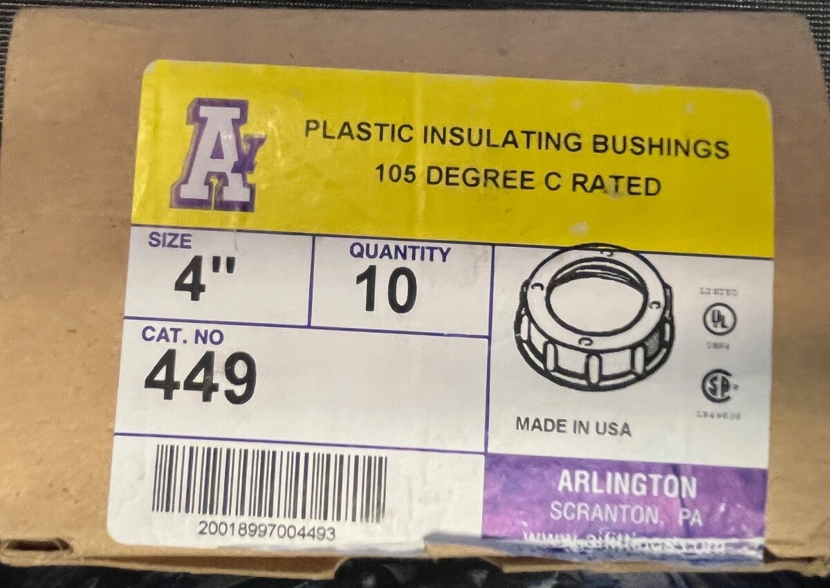 box of 10 Arlington 4" plastic insulating bushings (Model ARL 449) with a 105C temperature rating. Designed for electrical conduit protection at high temperatures, these bushings feature a rugged gray plastic construction and meet UL and CSA standards.