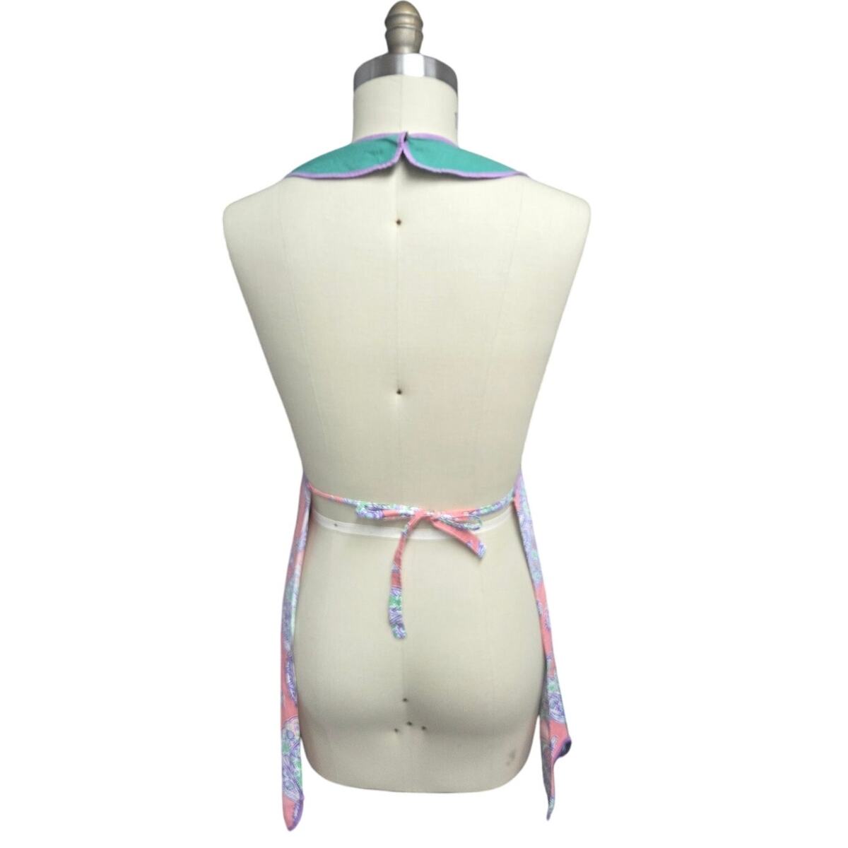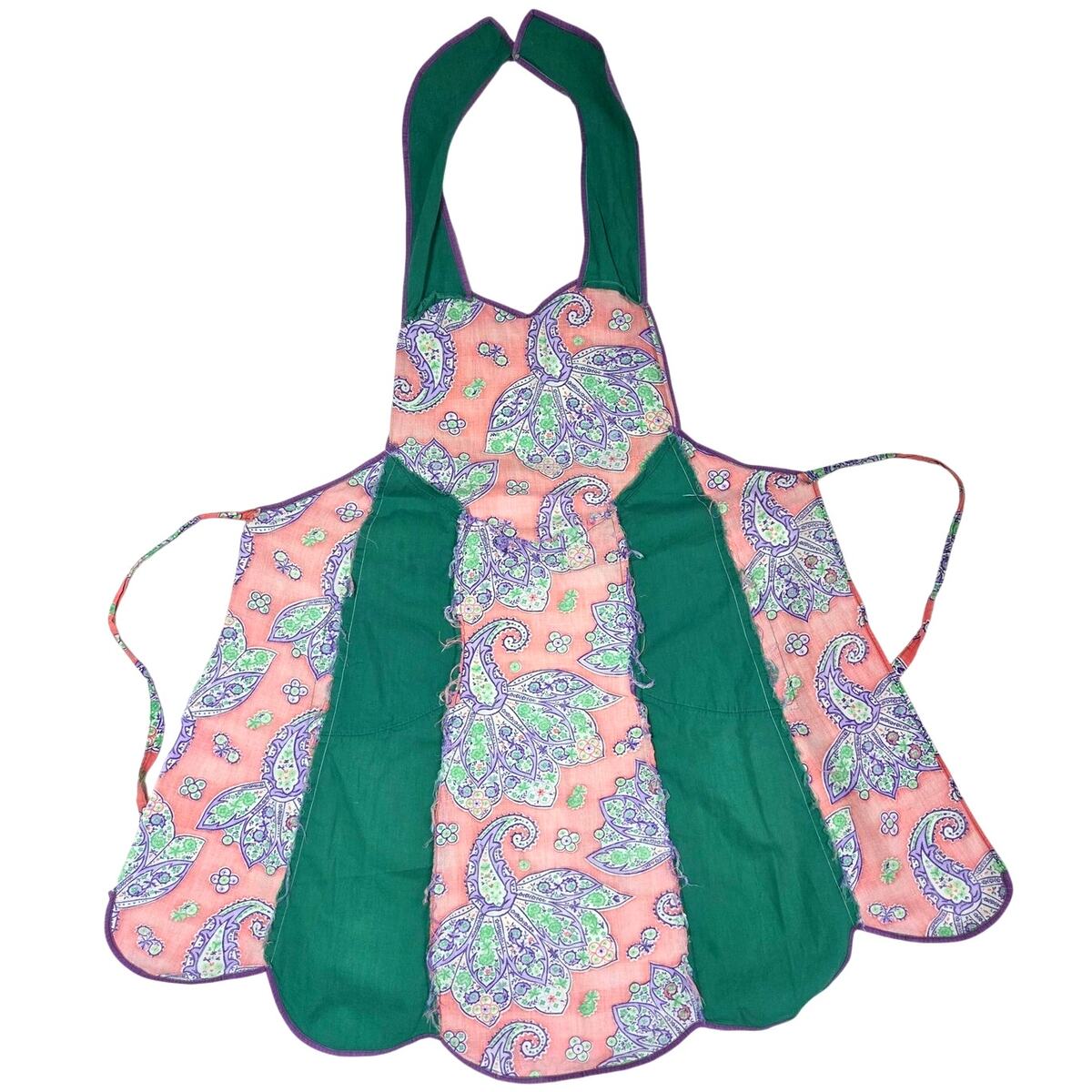 This apron is a beautiful example of early 20th-century domestic textiles ? most likely handmade from feedsack or printed cotton, a common practice during the Great Depression and WWII era in the U.S.