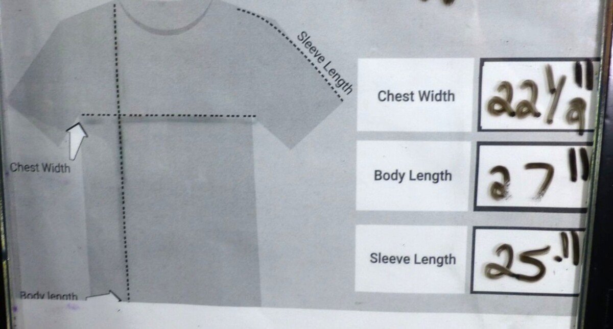 Chest width = 22 oe inches, Body length = 27 inches, Sleeve length = 25 inches