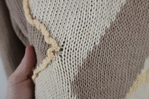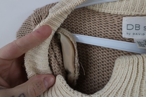Holes front middle. Fabric pulls, pilling. Color faded. Collar discolored. Has shoulder pads. Tag partially unstitched