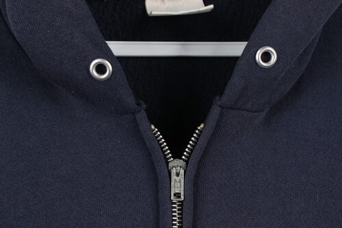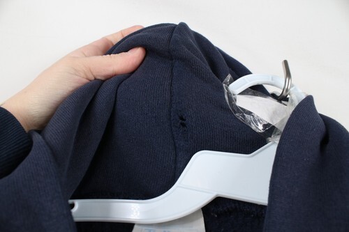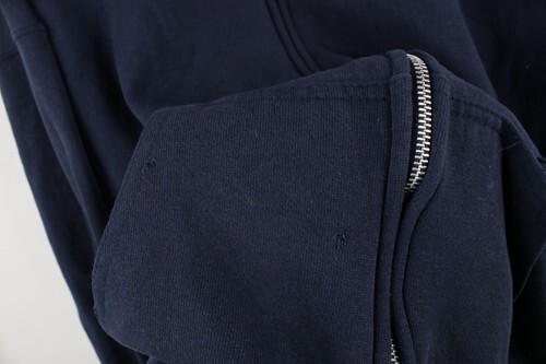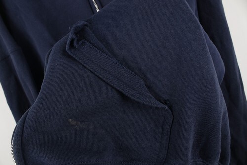Thrashed. Holes inner hood, front bottom, pockets. Pocket corners ripped. Missing string. Stains throughout. Hood, cuffs discolored. Color faded. Pilling inside and out. Made in USA