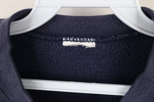 Collar, cuffs, bottom discolored. Blemish front, left arm. Has pilling. Color faded. Loose threads on design