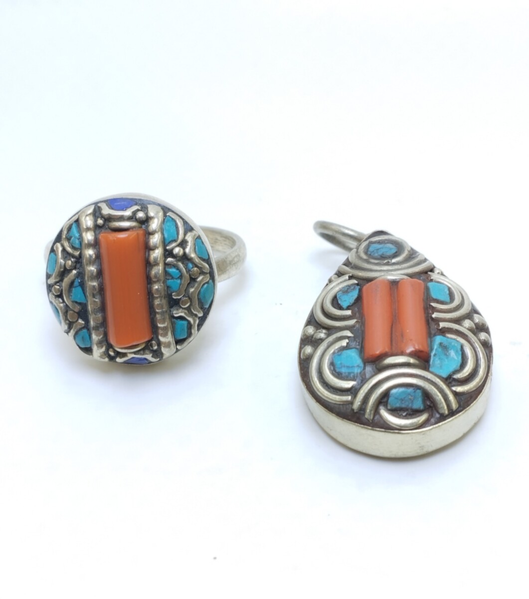 Beautiful handmade Moroccan Tuareg jewelry set, featuring a vintage-style ring and pendant.