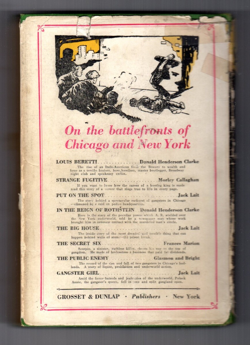 Former owner's name written in tiny script to the lower edge of the inside front cover, else near fine, square, and firm in nice green linen with bold black titles and decorative rules to the front cover and to the spine, nice yellow upper page edges; in an about very good dust jacket with great gangster portrait art to the front panel, with tears, small chips and clear tape reinforcing to the upper spine end area, small chips to the corners, chips and tears to the lower spine end, some tears and rubs to the rear panel's upper edge, and rubs to the flap folds, spine folds and spine panel.