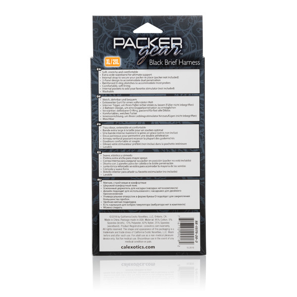 The Packer Gear Black Brief Harness is an ultra-comfortable, easy wear harness designed with powerful performance and comfort in mind. This classic harness has a supportive extra-wide waistband, soft stretchy material and internal probe straps for the ultimate support. Enjoy double penetration pleasure with the accommodating 2-panel design and unique bullet stimulation pocket. The durable, reinforced O-ring stretches to accommodate your favorite packer, vibrator or dildo. Beginners and expert users alike will love frustration-free pleasure with this easy-to-wear harness. Simply secure your favorite probe, slip into the extra stretchy waist and thigh straps and dive deep into passionate penetration or enjoy comfortable all-day wear. Enjoy easy clean up by machine washing and hanging to dry. Size 2X to 3X
