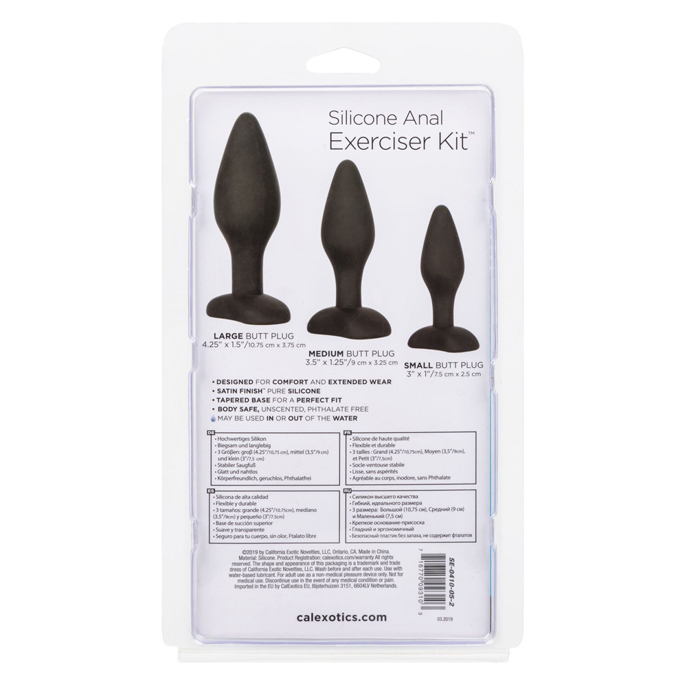 Pure Silicone anal training kit with Satin Finish Designed for comfort and extended wear 3 graduated sizes tapered for a perfect fit Flanged base for ease of use Smooth and seamless Hygienically superior and body safe