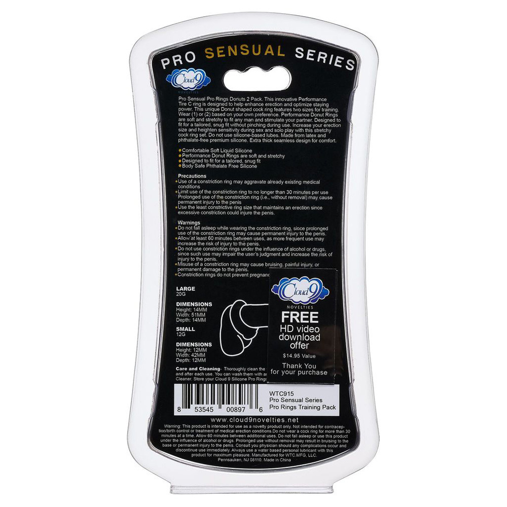Cloud 9 Pro Sensual Pro Rings Donuts 2 Pack. This innovative Performance Donut Cock ring is designed to help enhance erection and optimize staying power. This unique Donut shaped cock ring features two sizes for training. Wear one (or two) based on your own preference. Performance Cock Rings are soft and stretchy to fit any man and stimulate your partner. Designed to fit for a tailored, snug fit without pinching during use. Increase your erection size and heighten sensitivity during sex and solo play with this stretchy cock ring set. Do not use silicone based lubes. Made from latex and phthalate-free premium silicone. Extra thick seamless design for comfort.