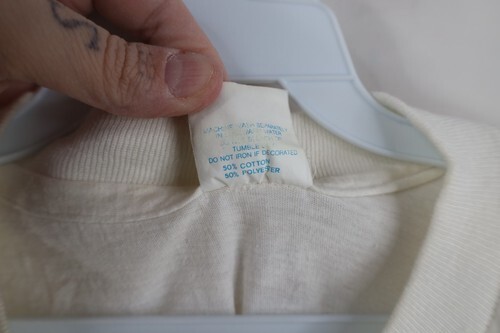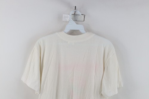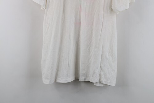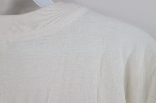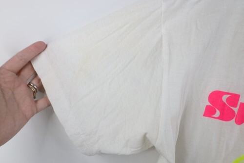 Stains throughout. Collar, arms discolored. Yellowed. Sheer fabric. Pilling. Graphics faded. Loose thread left shoulder