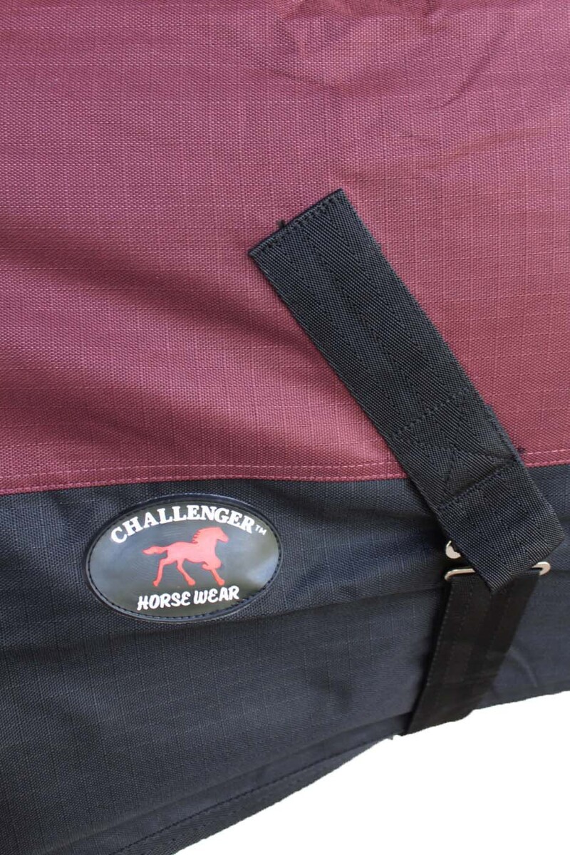 Challenger 1200 denier turnout horse sheet is constructed with a rip-stop waterproof, windproof, and breathable poly outer shell with 210 lining. Blanket features adjustable double front buckle snap closure, cross surcingles, neck adjust, and elastic leg straps for a secure and snug fit. Tail flap for added protection. Shoulder gussets offers freedom of movement. Fleece wither protection. Nickel plated hardware. No insulation/fill inside.