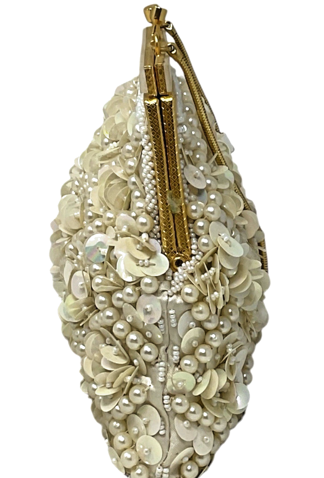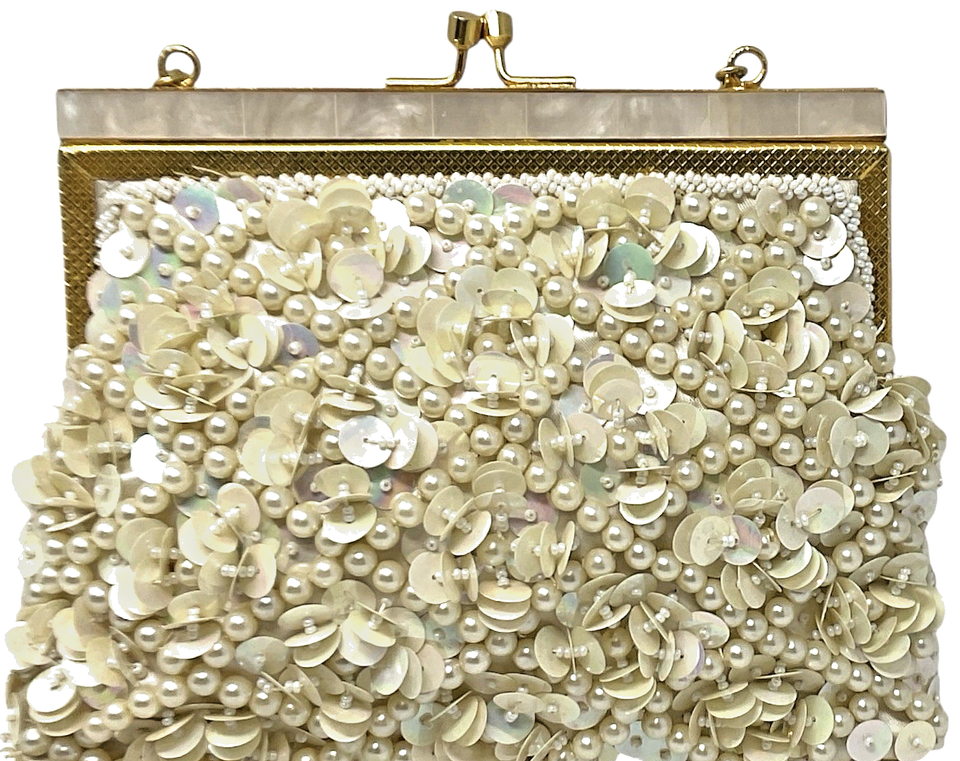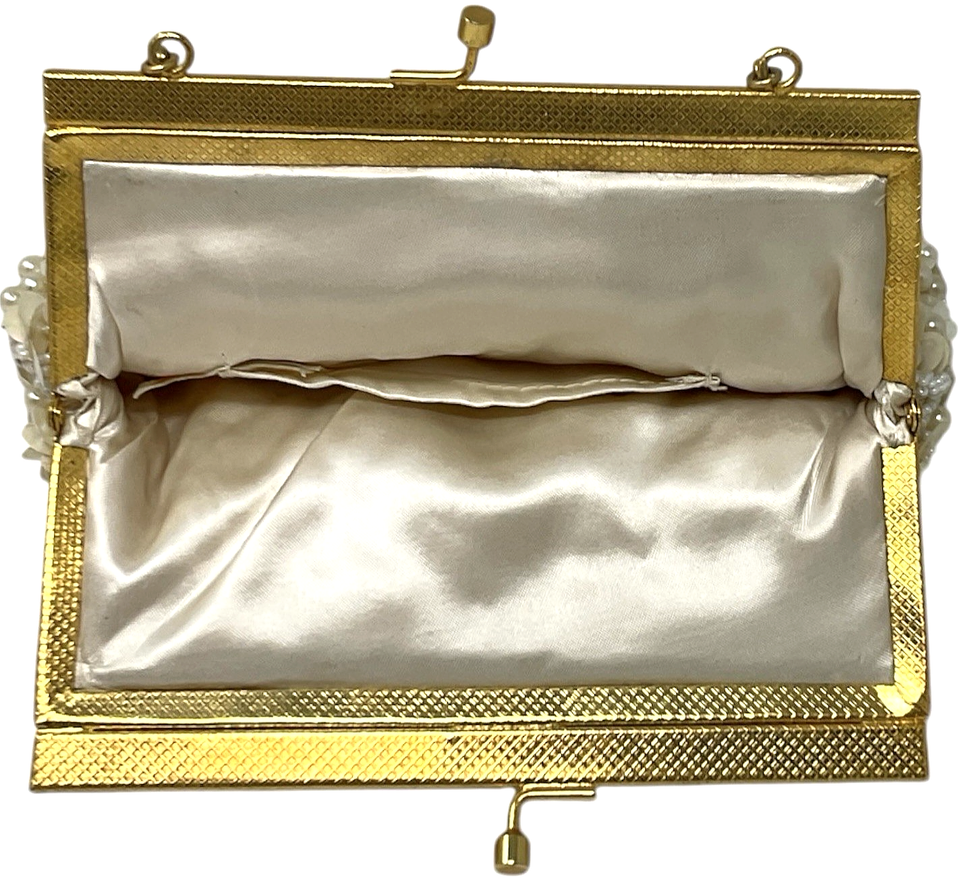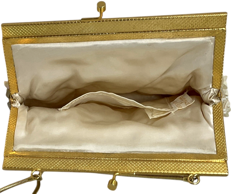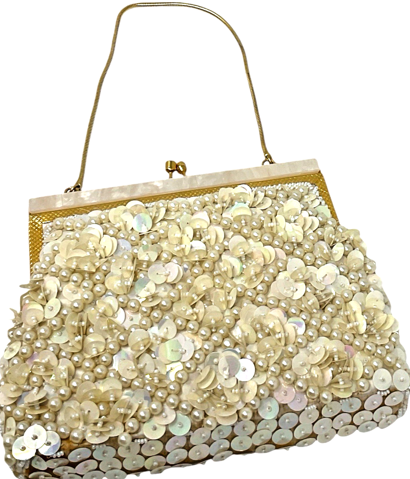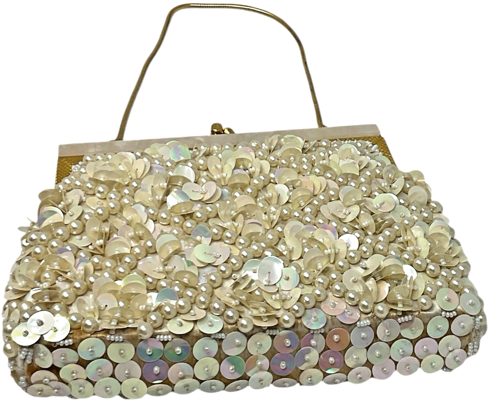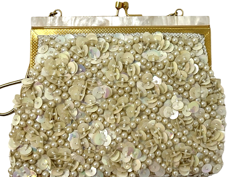 Vintage Ivory Beaded Purse Evening Handbag with Mother of Pearl Trim, Goldtone Handle/Hardware, Clasp Closure 6" x 7" Handmade in Hong Kong.